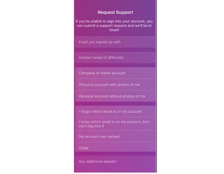 روی "Help Us Recover Your Account" ضربه بزنید و به جای درخواست کد امنیتی گزینه "I can’t access this email or phone number " را انتخاب کنید. فرم باز شده را با مشخصات حساب خود پر کنید و سپس گزینه "My account was hacked " را انتخاب کنید و روی گزینه"Request Support" کلیک کنید.
