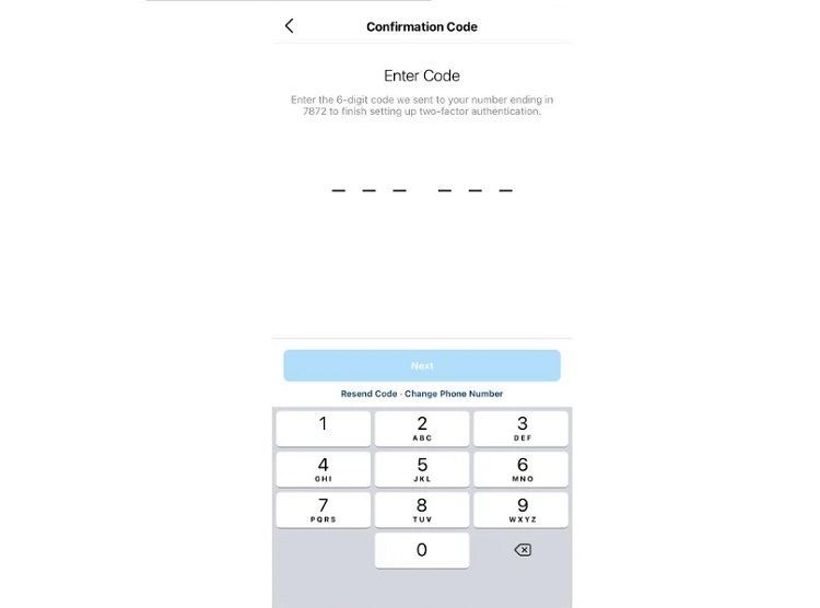 اگر در حساب شما شماره تلفن تایید شدهای وارد نشده باشد، از شما خواسته میشود شماره تلفن را وارد کنید. هنگامی که شماره تلفن خود را وارد کردید، روی دکمه "Next" ضربه بزنید. پس از آن هنگامی که از یک دستگاه ناشناس وارد حساب اینستاگرام خود میشوید، از شما خواسته میشود یک کد امنیتی را که از طریق پیامک دریافت میکنید وارد کنید.