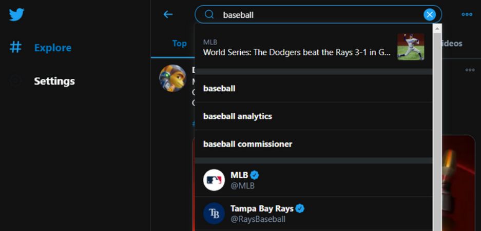 اگر به دنبال چیز خاصی در توئیتر هستید، نوار جستجو در بالای صفحه کاوش بسیار مفید است و بدون حساب کاربری نیز کار میکند. یک نام کاربری، موضوع یا هر چیز دیگری را برای مشاهده پیشنهادات تایپ کنید. توئیتر داستانها و حسابهایی را نشان میدهد که با هریک از کلماتی که وارد میکنید مطابقت دارند. روی یک داستان کلیک کنید تا بیشتر در مورد آن ببینید، یا اگر میخواهید فقط عبارت را جستجو کنید، Enter را بزنید.