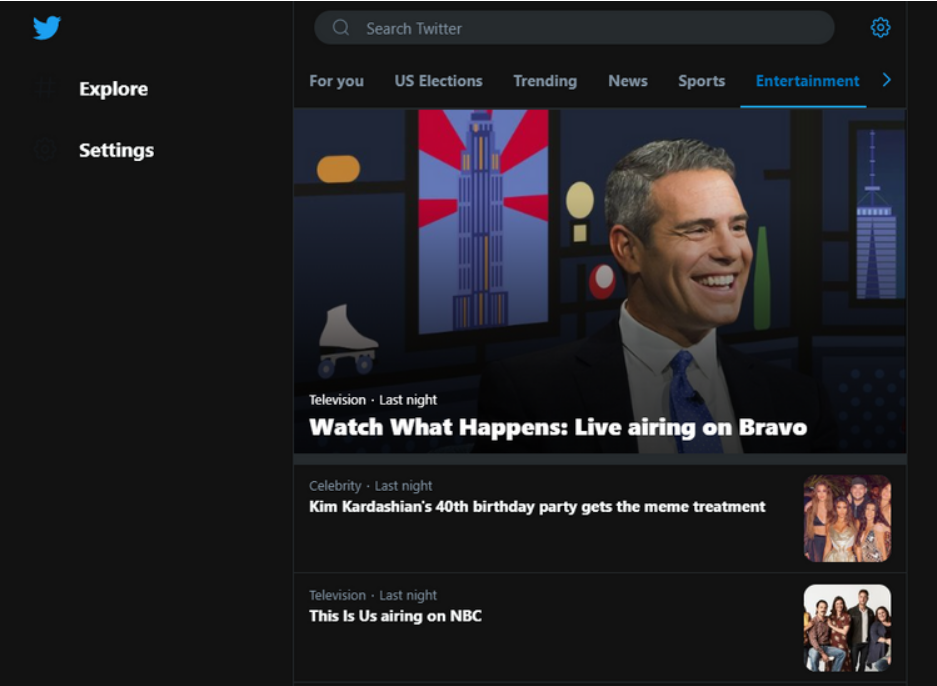 در صفحه اصلی توئیتر موضوعات پرطرفدار را در حوزههای مختلف خواهید دید. برای مشاهده اطلاعات بیشتر در مورد هرکدام روی آنها کلیک کنید. این مطالب شامل توئیتهای مرتبط، بهعلاوه ویدئوها، عکسها و خلاصهای از رویداد (بسته به موضوع) خواهد بود.