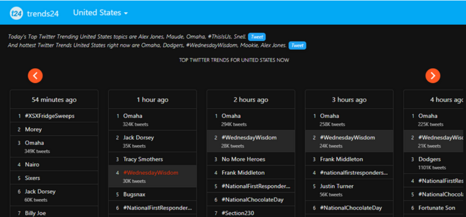 Trends۲۴: با یک لیست ساده و ساعتی به روز شده از موضوعات پرطرفدار، این سایت به شما امکان میدهد ببینید که در ۲۴ ساعت گذشته در توئیتر چه خبرهای داغ بوده است. یکی را انتخاب کنید تا ببینید که چگونه محبوبیت آن در طول ساعتها تغییر کرده، یا برای مشاهده اطلاعات بیشتر و مشاهده آن در توئیتر، روی آن کلیک کنید. از منوی کشویی در بالا برای فیلتر کردن هشتگها بر اساس کشور استفاده کنید. نمای پیش فرض در سراسر جهان است.