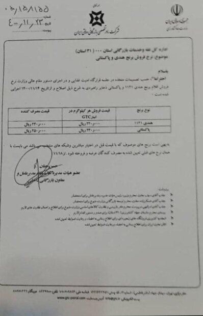 در متن این نامه با موضوع نرخ فروش برنج هندی و پاکستانی که در تاریخ ۲۳ بهمن ماه ۱۴۰۰ منتشرشده، آمده است: حسب تصمیمات متخذه در جلسه قرارگاه امنیت غذایی و در اجرای دستور مقام عالی وزارت نرخ فروش اقلام برنج هندی ۱۱۲۱ و پاکستانی ذخایر راهبردی به شرح ذیل اصلاح و از تاریخ ۱۴ بهمن ماه ۱۴۰۰ اجرایی شده است.