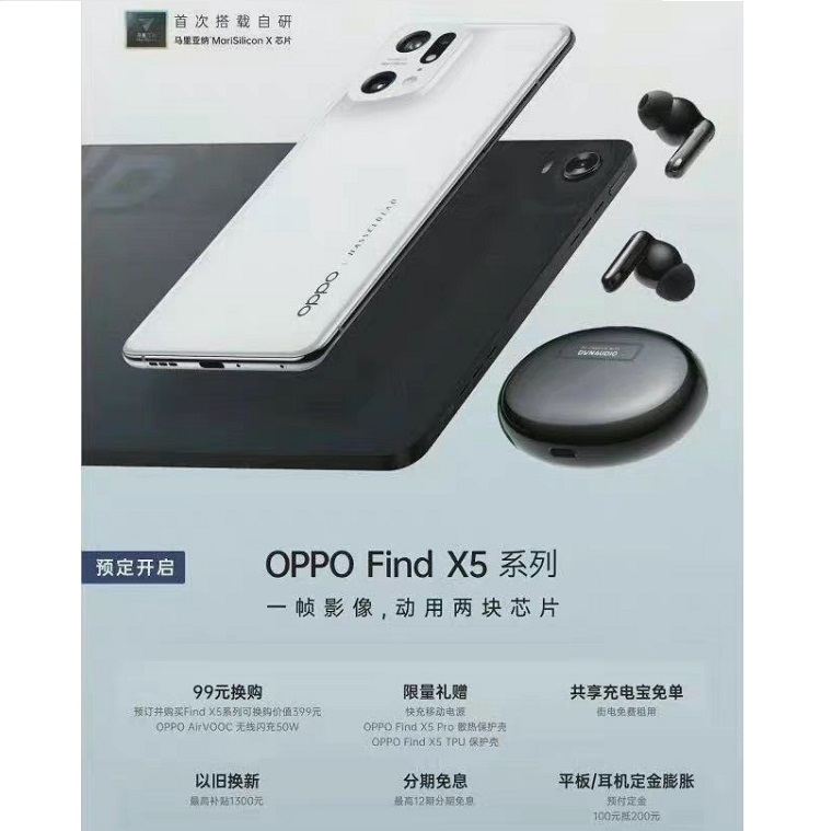 به گزارش فرارو، OPPO احتمالاً یک رویداد معرفی اختصاصی در چین برای معرفی Find X5 و X5 Pro برگزار خواهد کرد. یک منبع خبری معتبر بنام Digital Chat Station، پوستری در Weibo به اشتراک گذاشته که نه تنها تلفنهای همراه سری Find X5 را نشان میدهد، بلکه محصولات اعلام نشده دیگری مانند تبلت OPPO Pad و Earbuds Enco X2 TWS نیز در این پوستر وجود دارند. البته این پوستر در حال حاضر از این سایت حذف شده است.
