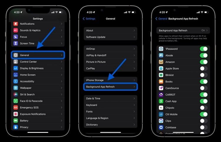 حالت کم مصرف، بهروزرسانی برنامههای پسزمینه (Background app refresh) را غیر فعال میکند. اما میتوانید برنامههایی را که از این ویژگی استفاده میکنند برای تجربه راحتتر و همچنین عمر باتری بهبود یافته سفارشی کنید. برای این کار به قسمت Settings > General > Background App Refresh بروید. همچنین میتوانید بجای Wi-Fi و Cellular، فقط از بهروزرسانی برنامه پسزمینه در Wi-Fi استفاده کنید یا اینکه این ویژگی را کاملاً خاموش کنید.
