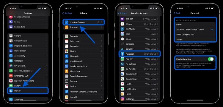 وارد قسمت Settings > Privacy > Location Services شوید. در این جا برنامههای تلفن همراه خود را مشاهده خواهید کرد. به برنامههایی که میخواهید همیشه از موقعیت مکانی شما استفاده کنند، توجه داشته باشید، میتوانید وضعیت آنها را به «هنگام استفاده»، «زمان بعدی بپرسید» یا «هرگز» تغییر دهید.