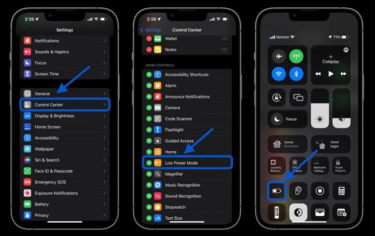 حالت کم مصرف راهی سریع برای افزایش عمر باتری خواهد بود. این ویژگی باعث تعلیق واکشی ایمیل، بهروزرسانی برنامه های پسزمینه، دانلود خودکار و موارد دیگر خواهد شد. این یک نوع ویژگی روزمره نیست، اما گاهی اوقات ویژگی مفیدی خواهد بود. برای دسترسی سریع به حالت کم مصرف وارد قسمت Settings > Battery شوید. در صورتی که میخواهید به Low Power Mode در قسمت Control Center دسترسی داشته باشید، به قسمت Settings > Control Center > Customize Controls بروید و در صورتی که نماد + در کنار Low Power Mode وجود نداشت، روی آن ضربه بزنید.