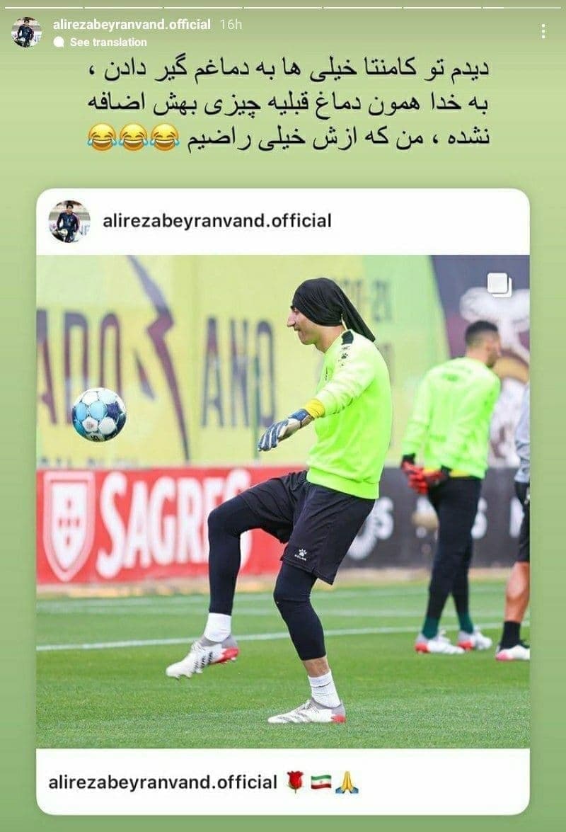 بیرانوند که همیشه در تمرینات روحیه بالایی دارد و در برنامه های تلویزیونی حسابی شوخ طبع است، در واکنشی جالب با انتشار یک پست در صفحه شخصی خود به بزرگی دماغش و شوخی هایی که او با می شود واکنش نشان داد.