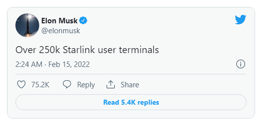 ایلان ماسک، رئیس اسپیس ایکس روز دوشنبه، ۱۴ فوریه توئیتی را منتشر کرد و نوتش: "در حال حاضر بیش از ۲۵۰ هزار کاربر استارلینک وجود دارد." این تعداد ۱۰۰ هزار مشتری بیشتر از آن چیزی است که در آگوست گذشته گزارش شده بود. استارلینک از مجموعهای از ماهوارههای مدار پایین زمین برای ارسال پهن باند به مشتریان روی زمین استفاده میکند. در حالی که هدف اصلی این شرکت ارائه خدمات به مکانهایی بدون اتصال به اینترنت یا با خدمات ضعیف است، تا به امروز شهروندان ۲۵ کشور میتوانند برای این سرویس ثبتنام کنند.