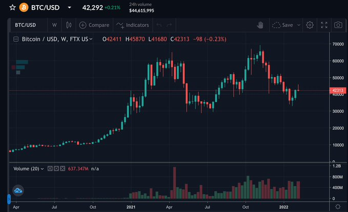 بیت کوین در ماه نوامبر سال گذشته تا حدود ۶۹ هزار دلار بالا رفت اما حالا تا ۴۴ هزار دلار پایین آمده است.