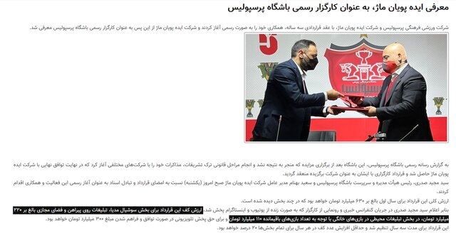 اواسط آذر ۱۴۰۰ و پس از کش و قوسهای فراوان، باشگاه پرسپولیس از کارگزار رسمی خود رونمایی و رسما اعلام کرد که از قبال این قرارداد ۳۳۰ میلیارد تومان بابت اجرای تبلیغات محیطی بازیهای خانگی و تبلیغات روی پیراهن درآمد خواهد داشت. البته که در نشست خبری رونمایی از کارگزار، سید مجید صدری به عنوان سرپرست وقت باشگاه رسما عنوان کرد که ۳۰۰ میلیارد تومان هم بابت حق پخش تلویزیونی در قرارداد ذکر شده که همان زمان هم بر کسی پوشیده نبود تحقق این مبلغ دور از انتظار است اما ادعای ۳۳۰ میلیاردی برای تبلیغات محیطی و پیراهن چقدر به واقعیت نزدیک است؟