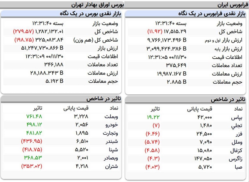 شاخص فرابورس نیز امروز بیش از ۱۱ واحد کاهش داشت و به ۱۷ هزار و ۵۱۵ واحد رسید.