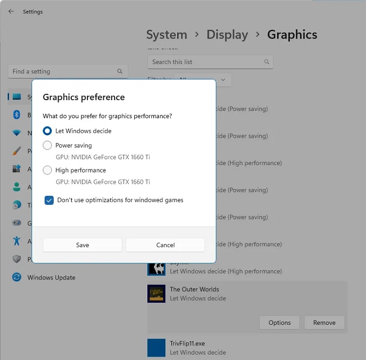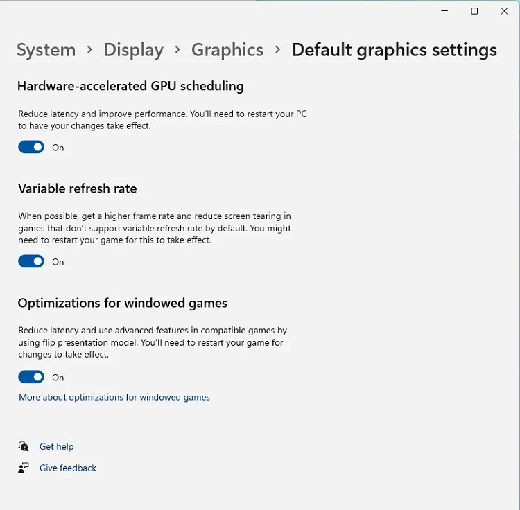 ویندوز ۱۱ با ویژگی Auto HDR از کنسولهای Xbox Series X / S عرضه میشود و مایکروسافت اکنون در حال انجام برخی بهینه سازیها برای بازیهای پنجرهای است که باعث میشود از Auto HDR و VRR پشتیبانی کنند. به گفته مایکروسافت، بهینهسازیها همچنین میتوانند «تأخیر قابل توجهی» را برای بازیهای قدیمیتر که در حالت پنجره اجرا میشوند، بهبود بخشند. یک تنظیم جدید Optimizations for windowed games در بخش گرافیکی رابط تنظیمات ویندوز ۱۱ وجود دارد که برای بازیهای قدیمی DirectX 10 و DirectX 11 اعمال میشود.