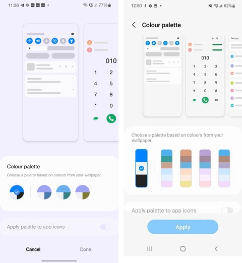 گوگل برای اندروید ۱۲ تغییر رنگ بخشهای مختلف رابط کاربری را امکانپذیر کرده و این قابلیت با One UI 4 به گوشیهای سامسونگ راه پیدا کرد. اما در One UI 4.0 بخش مربوط به این قابلیت با یک تغییر کوچک روبرو شده است. در نسخهی قبلی کاربران باید روی گزینههای دایرهای شکل ضربه میزدند اما در نسخهی جدید این رابط کاربری، شاهد گزینههای مستطیل شکل هستیم که درون آن تعداد رنگهای بیشتری نمایش داده میشود. بنابراین کاربران با یک نگاه میتوانند بفهمند که هرکدام از این گزینهها چه رنگهای جدیدی را برای رابط کاربری ارائه میدهند.