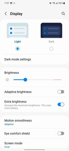اگر در تنظیمات نمایشگر گزینهی مربوط به روشنایی خودکار را غیرفعال کنید، یک گزینهی جدید به نام extra brightness پدیدار میشود که به کاربران اجازه میدهد حداکثر روشنایی را افزایش دهند. در بخش پایینی این گزینه هم یک متن قرار دارد که هشدار میدهد بهرهگیری از این مشخصه مصرف شارژ باتری را افزایش خواهد داد. با وجود اینکه گوشیهای سامسونگ از نظر تنظیم خودکار روشنایی عملکرد بسیار خوبی دارند، اما در هر صورت با غیرفعالسازی آن میتوانید از این قابلیت استفاده کنید.
