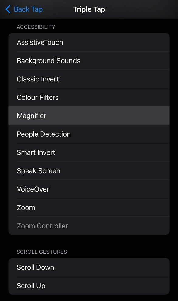 از ویژگیهای این دوربین مخفی میتوان به گرفتن اسکرین شات، افزایش یا کاهش صدا، بزرگنمایی، اسکرول و موارد دیگر اشاره کرد. برای استفاده یکی از این ویژگیها، ذره بین را انتخاب کنید. سپس با ضربه زدن روی پشت آیفون خود میتوانید برنامه را اجرا کنید. به خاطر داشته باشید که اگر قاب گوشی ضخیم دارید، ممکن است این ویژگی کار نکند. میتوانید با استفاده از مراحلی که در بالا ذکر شد، ویژگیهای کنترلهای Back Tap را در هر زمانی روشن یا خاموش کنید.