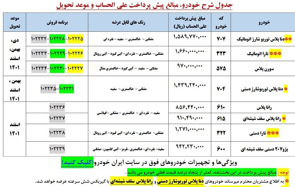 دناپلاس توربوشارژ دستی و اتوماتیک، تارا دستی و اتوماتیک، سورن پلاس، رانا پلاس، رانا پلاس با سقف شیشهای و پژو ۲۰۷ دستی سقف شیشهای، ۸محصول عرضه شده در این طرح پیشفروش است.