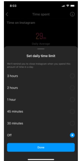 برخی کاربران مدت زمان زیادی را صرف شبکههای اجتماعی و به خصوص اینستاگرام میکنند،. یکی از قابلیتهای کاربردی اینستاگرام آن است که کاربران میتوانند زمان استفاده از این اپ را محدود کنند. برای مثال اگر گاربر بخواهد تنها یک ساعت در روز در این برنامه زمان صرف کند، میتواند در قسمت تنظیمات گزینه Daily Time Limit یا محدودیت زمانی روزانه را روی یک ساعت تنظیم کرده و با این کار، استفاده از این اپلیکیشن را مدیریت کنند.