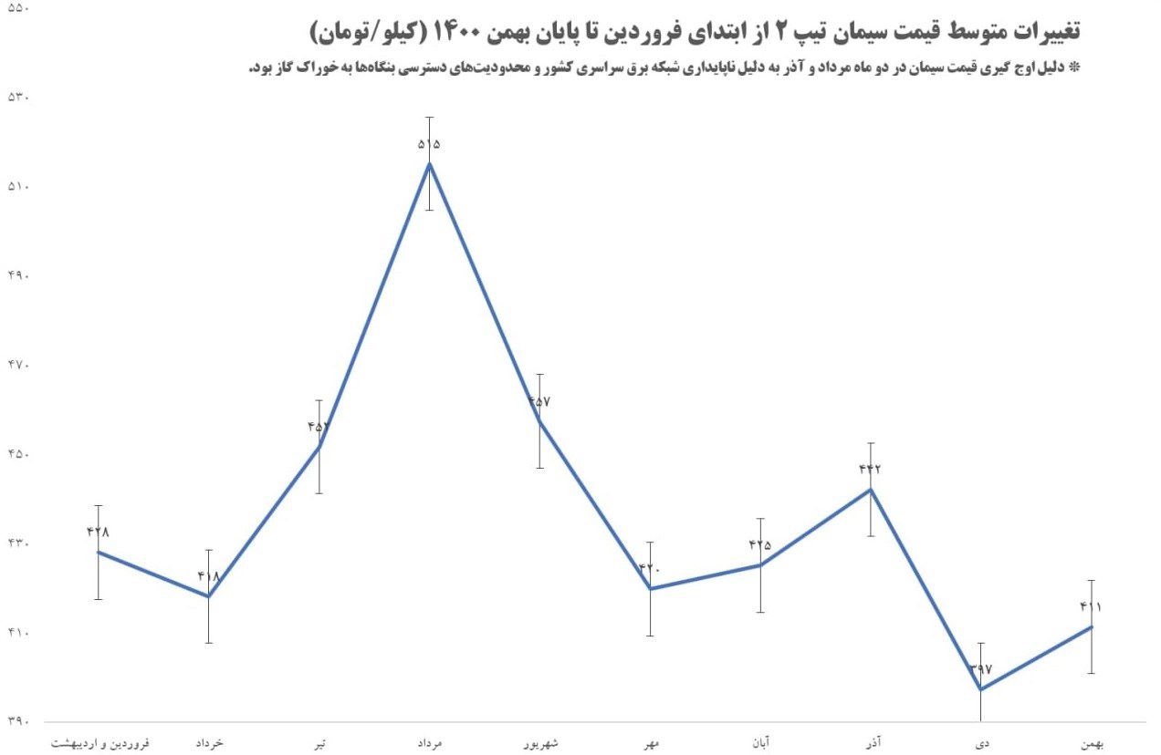 اما با کاهش گرمای هوا و به دنبال آن کاهش مصرف برق، شبکه برق به تدریج به وضعیت پایدار رسید و همین موضوع با متعادل کردن وضعیت عرضه و تقاضا در بازار، قیمت سیمان را دوباره در ماههای شهریور و مهر در مسیر کاهشی قرار داد؛ در این زمان ابلاغیه وزارت صمت مبنی بر ممنوعیت مبادلات سیمان خارج از بورس کالا باعث شد به یکباره عرضه های سیمان در بورس کالا افزایش یابد و همین امر کافی بود تا پایداری و ثبات همراه با روند نزولی قیمت ها به بازار سیمان کشور برگردد. براساس آمار، قیمت هر کیلو سیمان در شهریور به 457 تومان (کاهش 58 تومانی معادل 11 درصد) و در مهر به 420 تومان (کاهش 37 تومانی معادل 8 درصد) رسید.