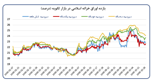 در دی امسال به دلیل کاهش انتظارات تورمی و متعاقب آن کاهش بازده اسمی انتظاری در بازار سایر داراییها، نرخهای بازده اوراق مالی اسلامی دولتی روند نزولی بهخود گرفت؛ به نحوی که در این ماه نرخ بازده اسناد مذکور با سررسیدهای یک، دو و سهساله، بهترتیب با ۰.۳۸، ۰.۴۸ و ۰.۲۰ واحد درصد کاهش نسبت به ماه قبل بهترتیب به ۲۳.۲۸، ۲۴.۴۳ و ۲۵.۰۶ درصد رسید.