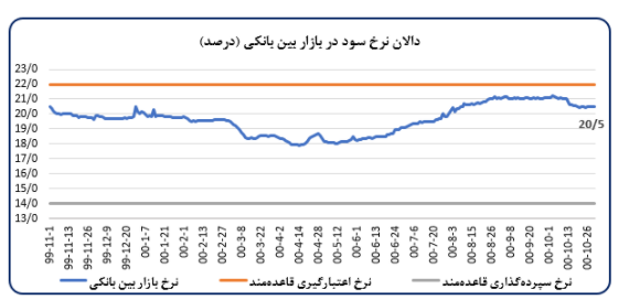 بررسی روند تغییرات نرخ بازار بینبانکی نشان دهنده کاهش این نرخ طی دی در قیاس با ماههای گذشته و تثبیت آن در محدوده ۲۰.۵ درصد بوده است.
