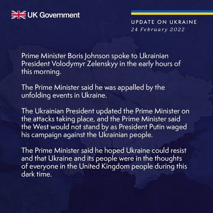 نخست وزیر انگلیس در تماس با رئیس جمهوری اوکراین ابراز امیدواری کرد که اوکراین بتواند مقاومت کند و در این روزهای تاریک مردم انگلیس به یاد مردم اوکراین هستند.