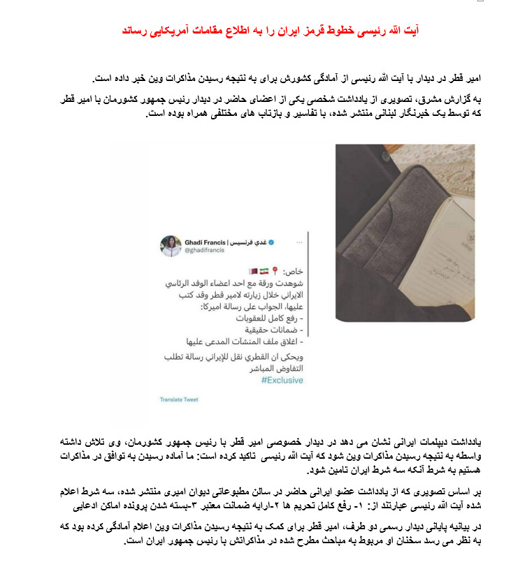 یادداشت دیپلمات ایرانی نشان می دهد در دیدار خصوصی امیر قطر با رئیس جمهور کشورمان، وی تلاش داشته واسطه به نتیجه رسیدن مذاکرات وین شود که آیت الله رئیسی تاکید کرده است: ما آماده رسیدن به توافق در مذاکرات هستیم به شرط آنکه سه شرط ایران تامین شود.
