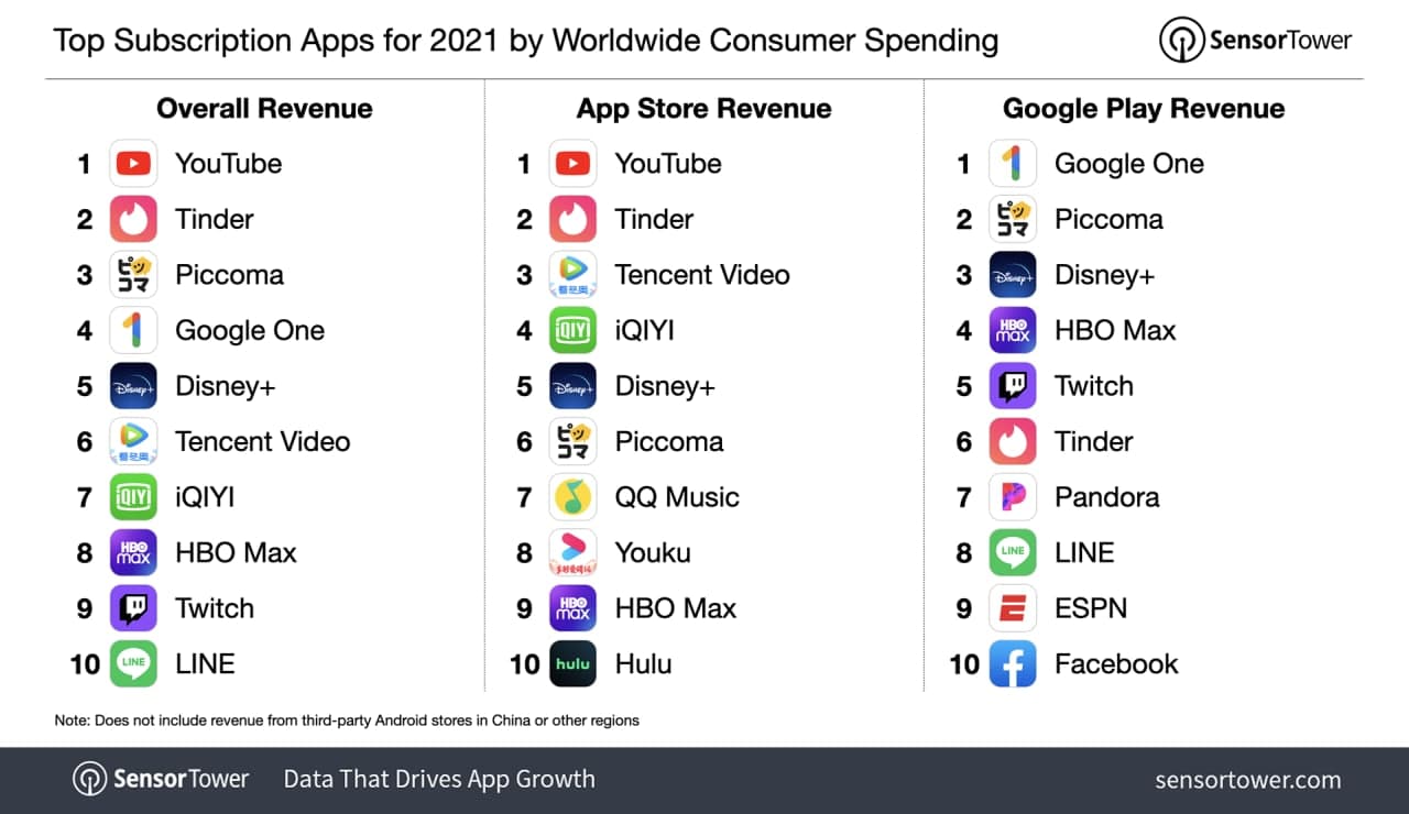از نظر اپلیکیشن‌ها، آلفابت (شرکت مالک گوگل) با یوتیوب در اپ استور و گوگل وان در گوگل پلی در صدر اپلیکیشن‌های اشتراکی سال 2021 تمام جهان قرار دارد. بر اساس این گزارش، یوتیوب در طول سال میلادی گذشته 1.2 میلیارد دلار و گوگل وان 1.1 میلیارد دلار در سطح جهانی درآمد داشته‌اند.