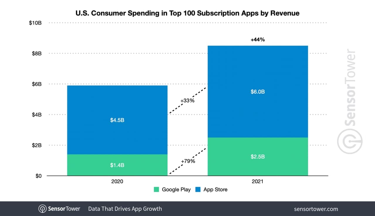 شرکت تحلیلگر بازار Sensor Tower در گزارش خود، درآمد به دست آمده اپ استور و گوگل پلی از اشتراک‌ها در طول سال 2021 را نشان داده است. از نظر اعداد و ارقام، اشتراک‌های اپ استور در سطح جهانی 13.5 میلیارد دلار برای غول کوپرتینویی درآمد ایجاد کرده و این میزان برای گوگل پلی و غول موتور جستجو 4.8 میلیارد دلار بوده است. البته باید به این نکته توجه داشت که هزینه‌های انجام شده در گوگل پلی با سرعت بسیار بیشتری در حال رشد است.