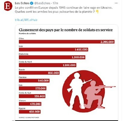 نشریه فرانسوی لزاکو در حساب کاربری توئیتر خود با اشاره به این که بدترین جنگ در اروپا از سال ۱۹۴۵ در اوکراین رخ داده است، جدولی از قویترین ارتشهای جهان بر اساس تعداد سربازان منتشر کرد.