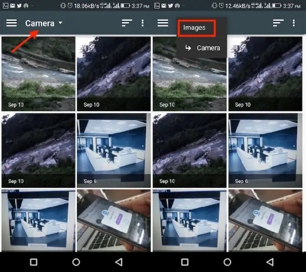 ۵- در اینجا میتوانید عکسهای گرفته شده با دوربین گوشی را مشاهده کنید. برای اینکه بتوانید سایر تصاویر موجود در گالری را هم ببینید، باید روی گزینه Camera در بالای صفحه ضربه زده و سپس Images را انتخاب کنید. اگر در صفحه باز شده پوشههای مختلفی را مشاهده کردید، آن پوشهای را که عکس مورد نظراتان داخلش قرار دارد، لمس کنید تا بتوانید در نهایت تصویر را انتخاب کنید.