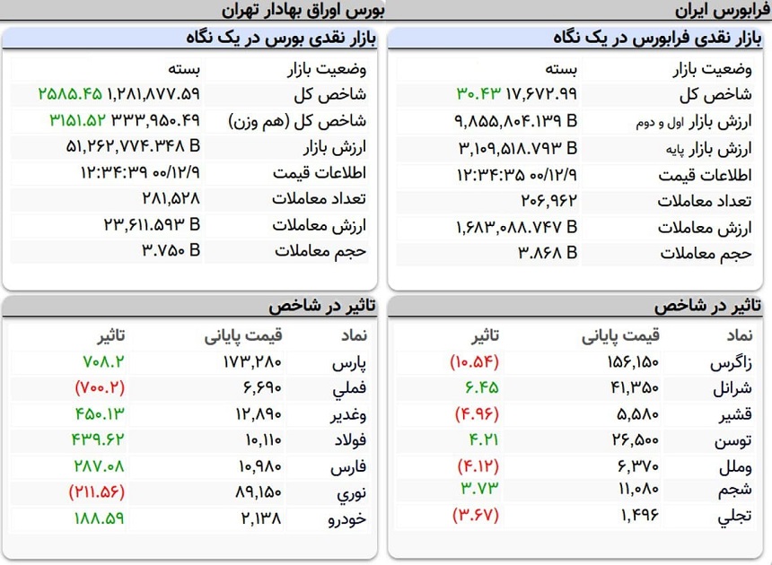 همچنین پتروشیمی زاگرس (زاگرس)، قند شیروان قوچان و بجنورد (قشیر)، اعتباری ملل (وملل)، تجلی توسعه معادن و فلزات (تجلی)، بیمه پاسارگاد (بپاس) و پلیمر آریا ساسول (آریا) تاثیر منفی بر شاخص فرابورس داشتند.