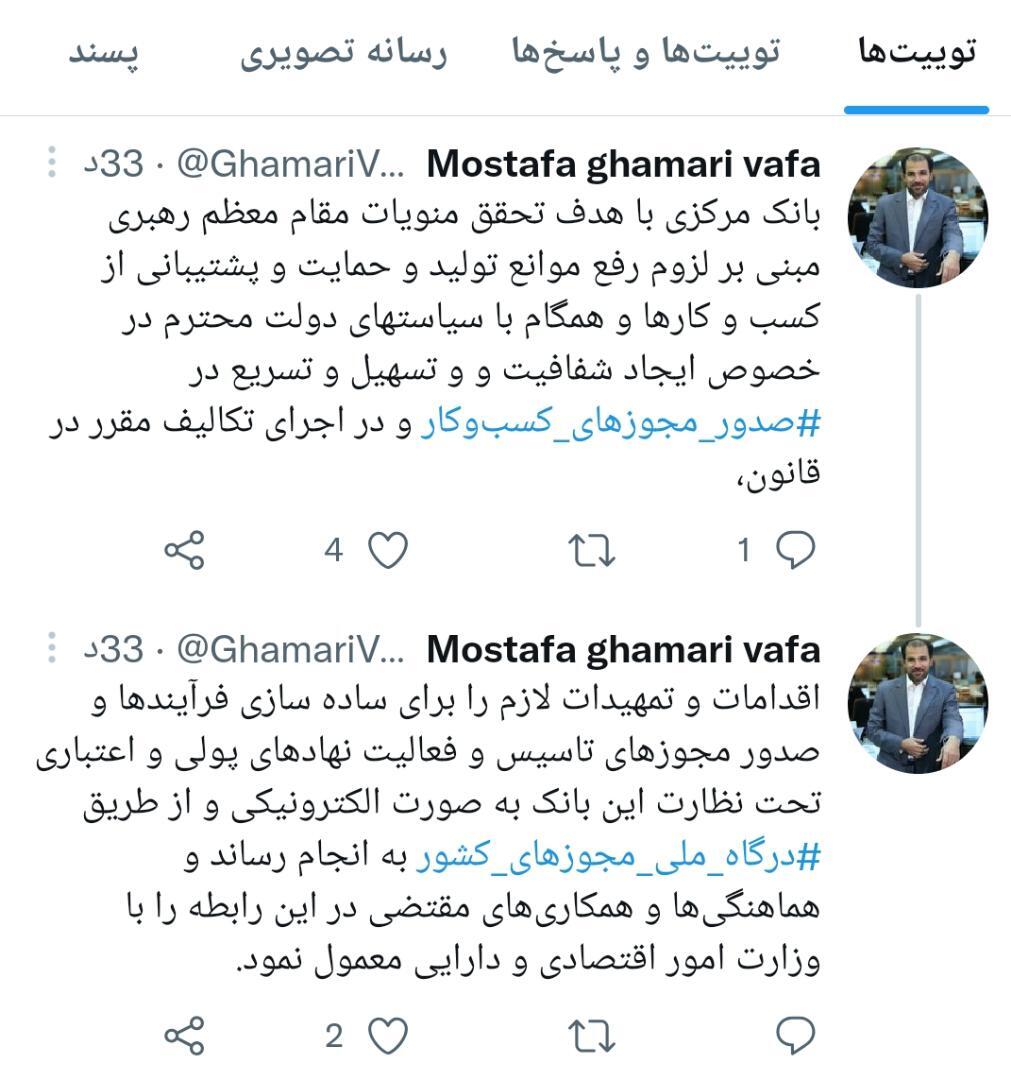 مدیر روابط عمومی بانک مرکزی در توئیتی اعلام کرد: بانک مرکزی با هدف تحقق منویات مقام معظم رهبری مبنی بر لزوم رفع موانع تولید و حمایت و پشتیبانی از کسب و کارها و همگام با سیاستهای دولت در خصوص تسهیل در صدور مجوزهای کسب و کار اقدامات لازم را برای صدور مجوزهای تاسیس و فعالیت نهادهای پولی و اعتباری تحت نظارت این بانک به صورت الکترونیکی و از طریق درگاه ملی مجوزهای کشور به انجام رساند.