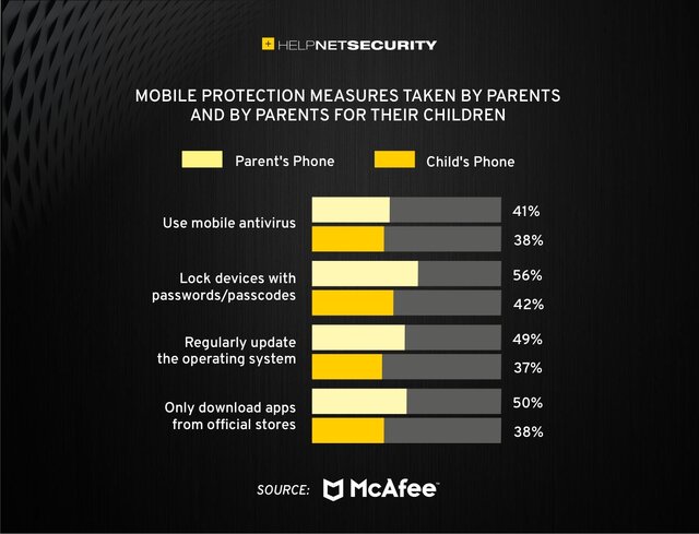 دستگاههای تلفن همراه کودکان در سطح جهانی کمتر محافظت میشوند. ۵۶ درصد از والدین از رمز عبور برای محافظت از دستگاههای تلفن همراه استفاده میکنند، در حالی که تنها ۴۱ درصد از کودکان و نوجوانان از رمز عبور استفاده میکنند که خطرات ایمنی ایجاد میکند.