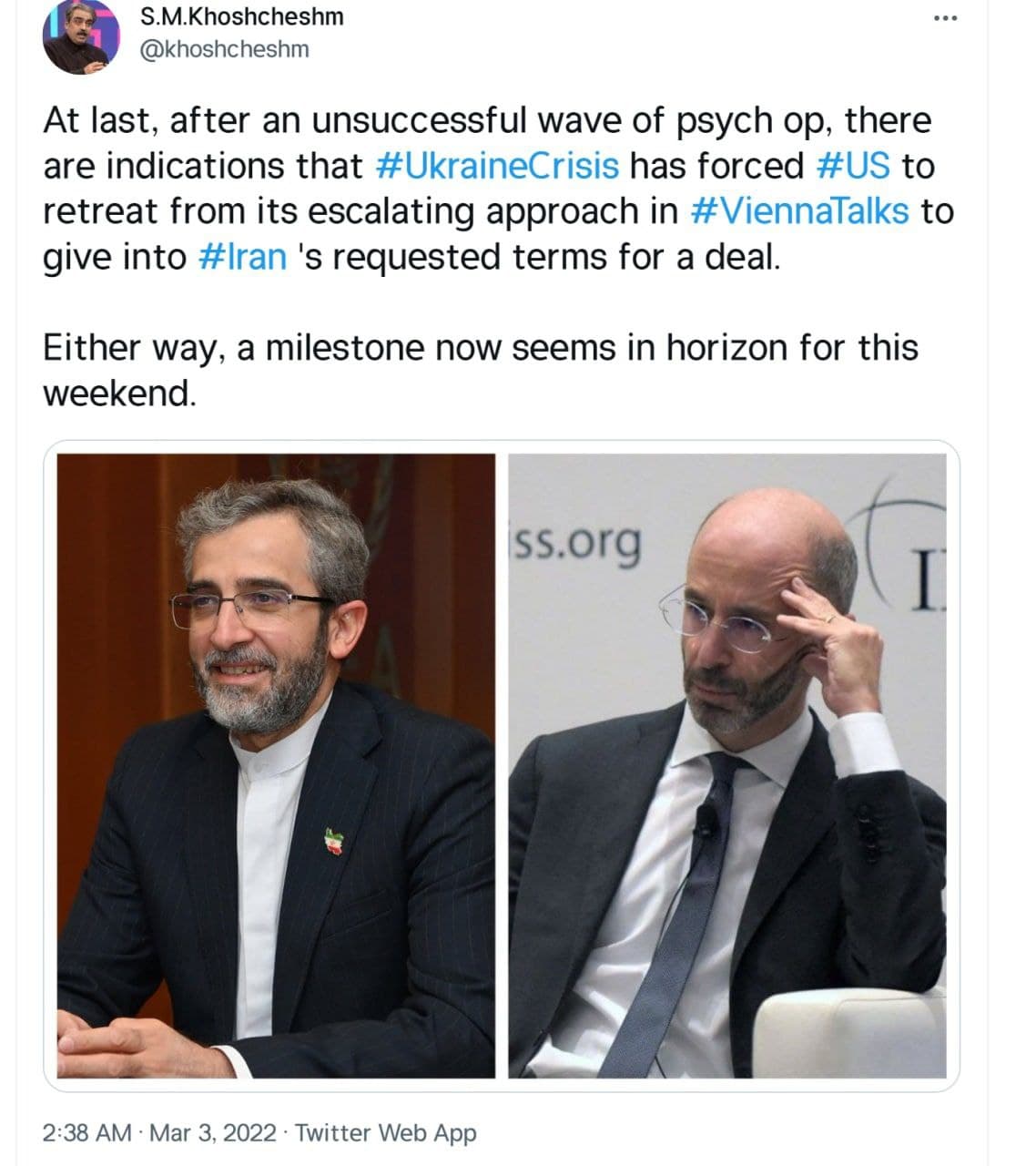 به گزارش سایت طلا،خوش چشم مشاور تیم مذاکره کننده در وین گفته است: سرانجام، پس از یک موج ناموفق عملیات روانی، نشانه هایی وجود دارد که بحران اوکراین، آمریکا را مجبور به عقب نشینی از رویکرد تشدیدکننده خود در گفتگوهای وین برای تن دادن به شرایط درخواستی ایران برای توافق کرده است.