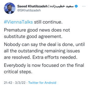 سعید خطیبزاده سخنگوی وزارت امور خارجه جمهوری اسلامی ایران دقایقی قبل در توئیتی نوشت: مذاکرات وین هنوز هم ادامه دارد.
