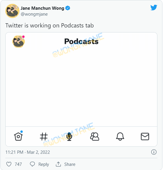 شرکت توئیتر قصد دارد یک برگه مخصوص برای پادکستها را به شبکه اجتماعی خود اضافه کند. در همین راستا به تازگی یکی از توسعه دهندگان توئیتر تصاویری از قابلیت جدید منتشر کرده که نشان میدهد در نوار منوی پایین این شبکه اجتماعی یک میکروفون اضافه شده است.