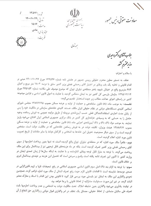 همچنین در این نامه تأکید شده ضمن بررسی چگونگی واگذاری این ملک به وزیر کشور سابق، اقدامات قانونی برای رفع تصرف از ملک مذکور که مصداق تبعیض ناروا است، انجام شود.