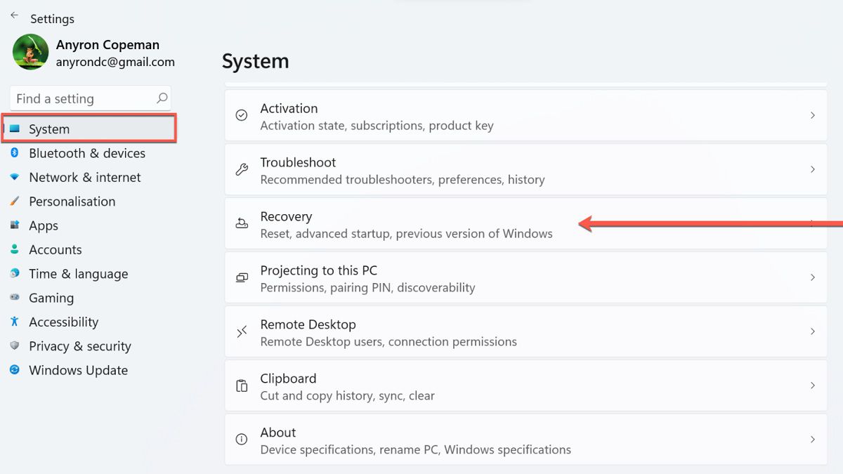 به سمت پایین اسکرول کرده و روی گزینه «Recovery» کلیک کنید.