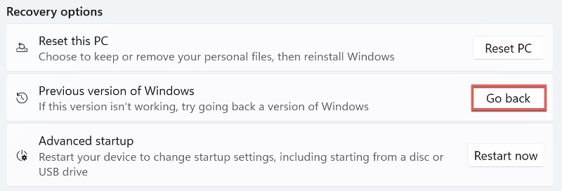در بخش «Recovery Options»، باید گزینه «Previous version of Windows» را ببینید. روبهروی آن گزینه «Go back» قرار دارد، روی آن کلیک کنید.