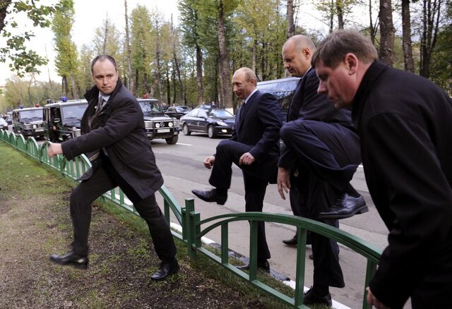 پوتین در جاده در میان کاروانی از وانتهای زرهی سنگین، سوار خودرویی میشود که حامل اپراتورهای ویژه نظامی مجهز به AK-47، نارنجکانداز ضدتانک و موشکهای ضد هوایی قابلحمل است. هنگامیکه او در ملاء عام بیرون میآید، چهار حلقه امنیتی او را احاطه کردهاند که از محافظان شخصیاش شروع میشود، تعداد دیگری هم در میان جمعیت پنهان شدهاند و تک تیراندازها روی پشتبامهای اطراف نشستهاند.
