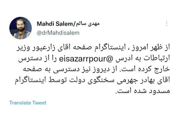 مهدی سالم رئیس مرکز روابط عمومی و مرکز اطلاع رسانی وزارت ارتباطات و فناوری اطلاعات در توئیتی نوشت: ‏از ظهر امروز، اینستاگرام صفحه آقای زارع پور وزیر ارتباطات به آدرس @eisazarrpour را از دسترس خارج کرده است. از دیروز نیز دسترسی به صفحه آقای بهادر جهرمی سخنگوی دولت توسط اینستاگرام مسدود شده است.