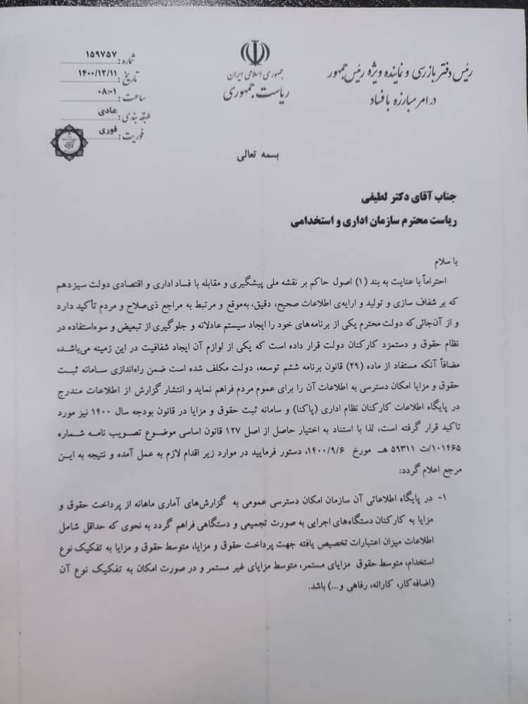 رئیس دفتر بازرسی ویژه رئیسجمهوری و نماینده ویژه وی برای هماهنگی، پیگیری و اجرای نقشه ملی پیشگیری و مقابله با فساد در دستگاههای اجرایی در نامهای به رئیس سازمان امور اداری و استخدامی خواستار ایجاد دسترسی عمومی به اطلاعات سامانه ثبت حقوق و مزایای مدیران شد.
