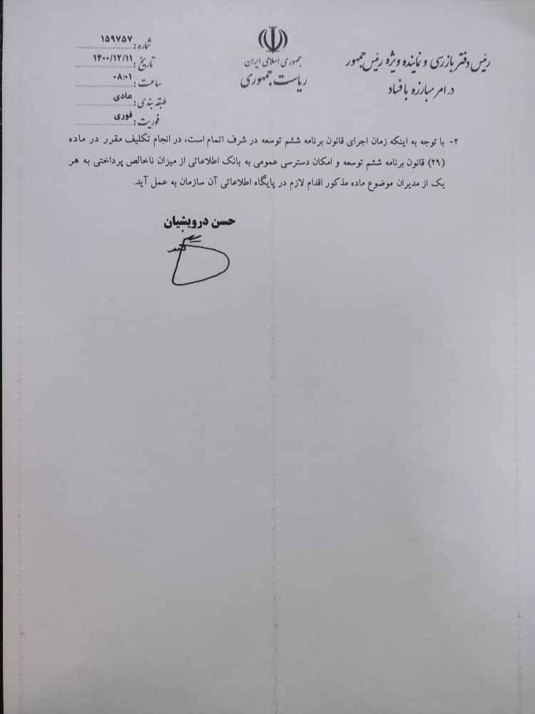 حجت الاسلام و المسلمین حسن درویشیان نماینده ویژه رییس جمهوری و هیات وزیران در امر مبارزه با فساد در راستای سیاست دولت در شفاف سازی و تحقق نظام عادلانه حقوق و مزایای کارکنان دولت و در پیگیری اجرای تکالیف قانونی طی ابلاغیه مورخ ۱۴۰۰/۱۲/۱۱ از رییس سازمان اداری و استخدامی کشور خواسته است ضمن ایجاد دسترسی عمومی به گزارش های آماری ماهانه از میانگین های پرداخت حقوق و مزایا در دستگاه های مختلف اجرایی در پایگاه اطلاعاتی آن سازمان، دستور دهد هر چه زود تر امکان دسترسی عمومی به بانک اطلاعاتی از ناخالص پرداختی به مدیران دستگاه های اجرایی فراهم شود.