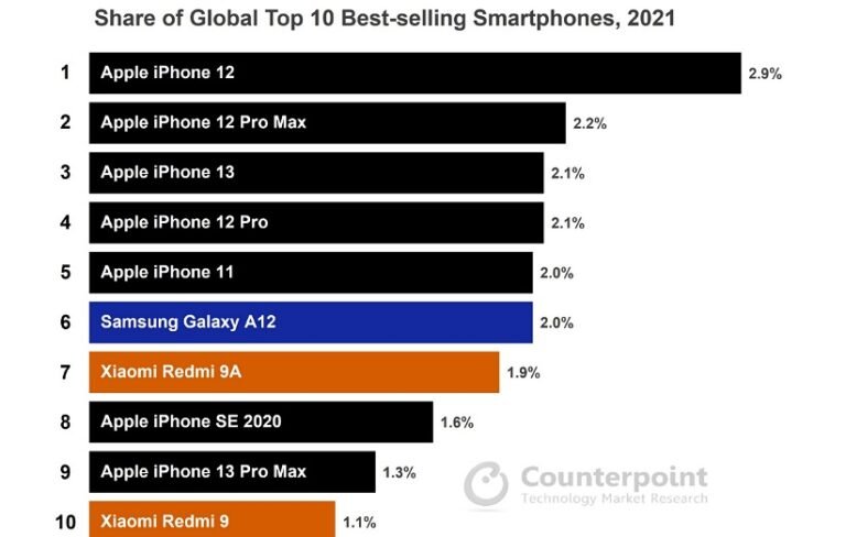 بر اساس این لیست منتشر شده، گوشی هوشمند آیفون ۱۲ اپل پرفروشترین گوشی هوشمند در سال ۲۰۲۱ لقب گرفت و آیفون ۱۲ پرومکس و آیفون ۱۳ که پرفروشترین گوشیهای سه ماههی پایانی سال ۲۰۲۱ بودند در ردههای دوم و سوم این لیست قرار گرفتند. همچنین باید اشاره کنیم که آیفون ۱۲ پرو رتبهی چهارم و آیفون ۱۱ که محصول سال ۲۰۱۹ اپل است ردهی پنجم این لیست را مال خود کرده است.