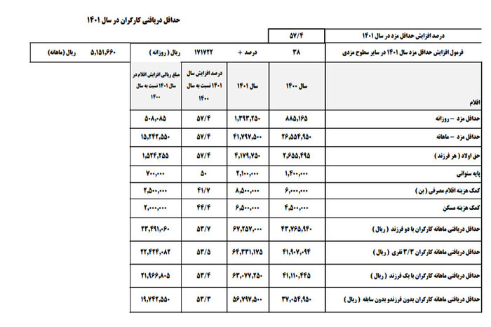 جدول جزئیات افزایش ۵۷ درصدی حداقل حقوق در سال ۱۴۰۱