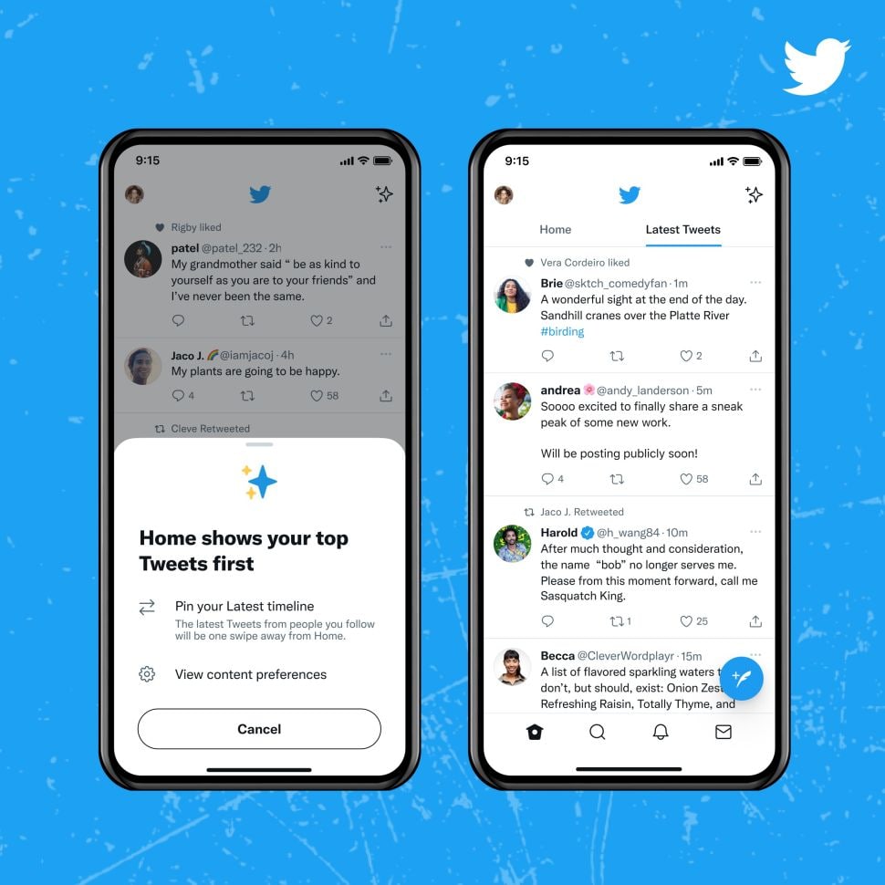 توییتر برگه جدیدی را در قسمت بالای نسخه iOS اضافه کرده تا کاربران راحت‌تر بتوانند نحوه نمایش پست‌های تایم لاین را بین دو گزینه «جدیدترین توییت‌ها» و «خانه» که توییت‌ها را به صورت الگوریتمی نشان می‌دهد، تغییر دهند.