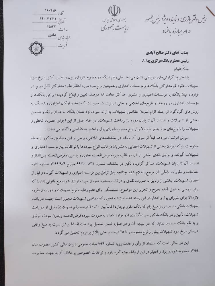 جناب آقای دکتر صالح آبادی ریاست محترم بانک مرکزی