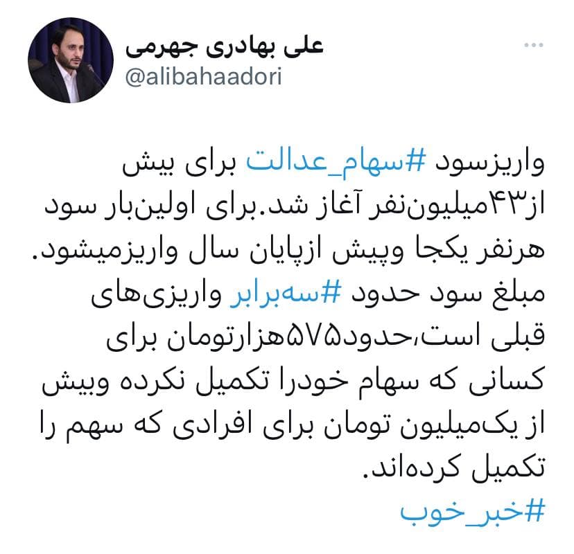 «واریز سود سهام عدالت برای بیش از ۴۳ میلیون نفر آغاز شد. برای اولینبار سود هر نفر یکجا و پیش از پایان سال واریز میشود.