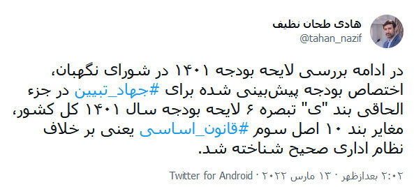 هادی طحان نظیف در صفحه شخصی خود در توییتر نوشت: «در ادامه بررسی لایحه بودجه ۱۴۰۱ در شورای نگهبان، اختصاص بودجه پیشبینی شده برای جهاد تبیین در جزء الحاقی بند "ی" تبصره ۶ لایحه بودجه سال ۱۴۰۱ کل کشور، مغایر بند ۱۰ اصل سوم قانون اساسی یعنی بر خلاف نظام اداری صحیح شناخته شد».