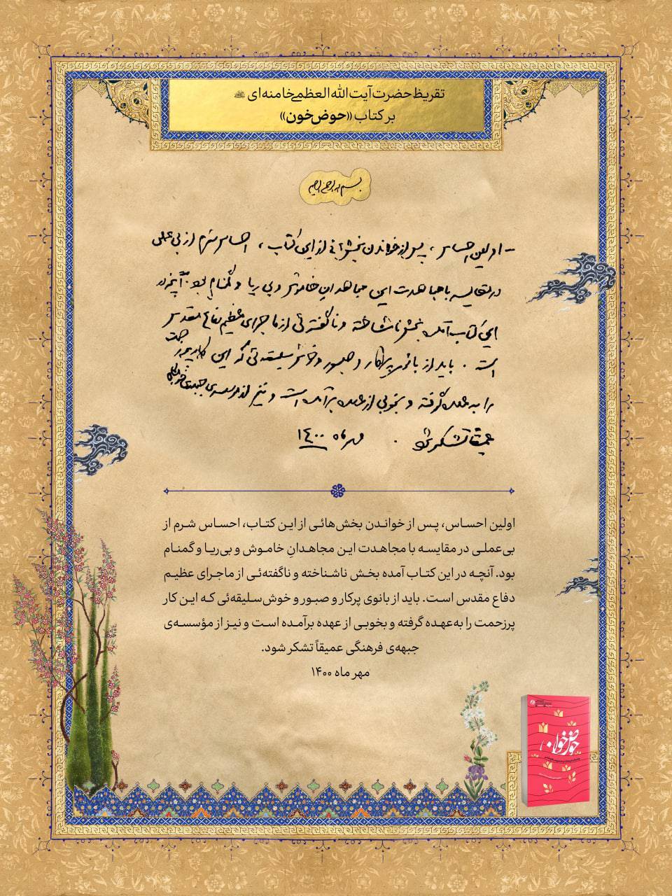 در مراسم دوازدهمین پاسداشت ادبیات جهاد و مقاومت، تقریظ حضرت آیتالله خامنهای بر کتاب «حوض خون» منتشر شد.